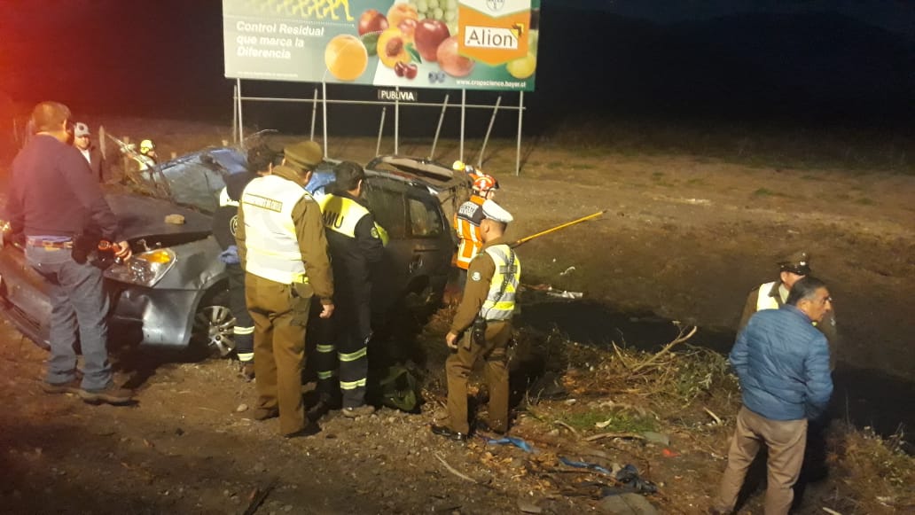 Por causas que estan siendo investigadas por la SIAT de la Prefectura de Carabineros Cachapoal, la conductora del automóvil Margarita Toledo Torres de 57 años en los momentos que se desplazaba en dirección sur, perdió el control del vehículo saliéndose de la pista de circulación terminando su recorrido al interior de un canal de regadío falleciendo en forma instantánea.