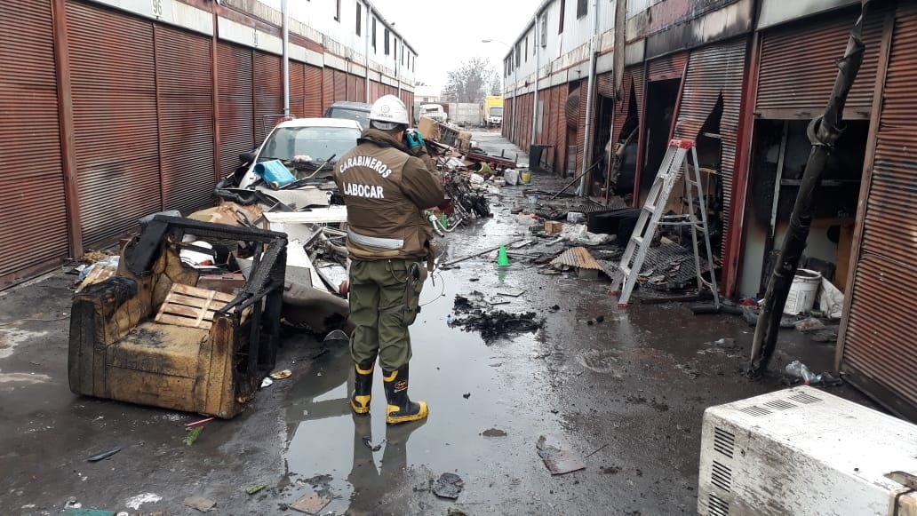 Peritos del Laboratorio de Criminalística de la Prefectura de carabineros Cachapoal investigan el gigantesco incendio que la mañana de este viernes consumió siete locales comerciales de la Vega La Cruz de Rancagua y que además provocó serios estructurales en varias bodegas del recinto ubicado en el sector oriente de la capital regional.