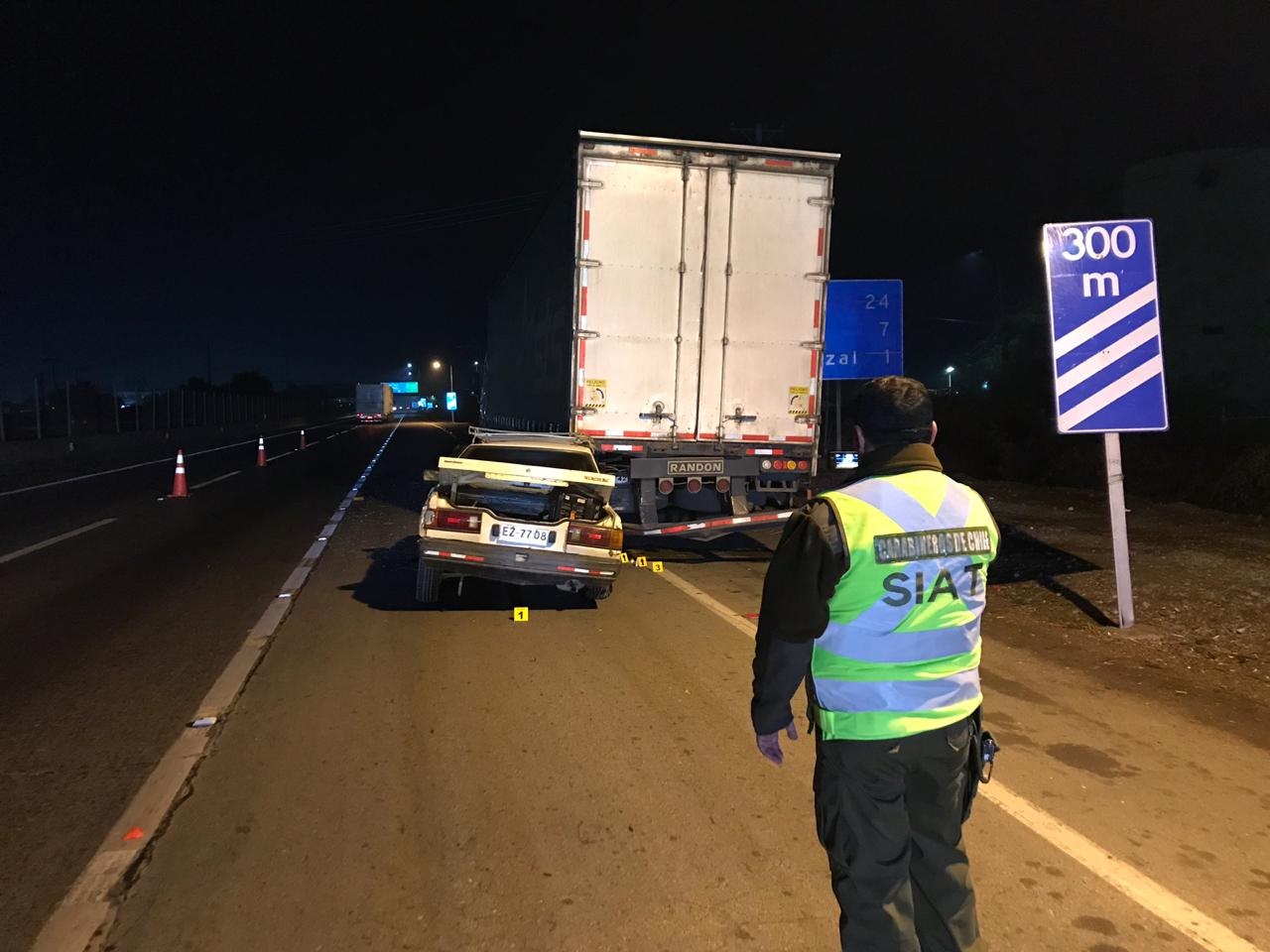 Trágica muerte sufrió un joven de 19 años, luego que el automóvil que conducía chocara con la parte posterior de un camión que se encontraba estacionado a un costado de la pista de aceleración, en la Ruta 5 Sur, frente a la comuna de San Francisco de Mostazal.